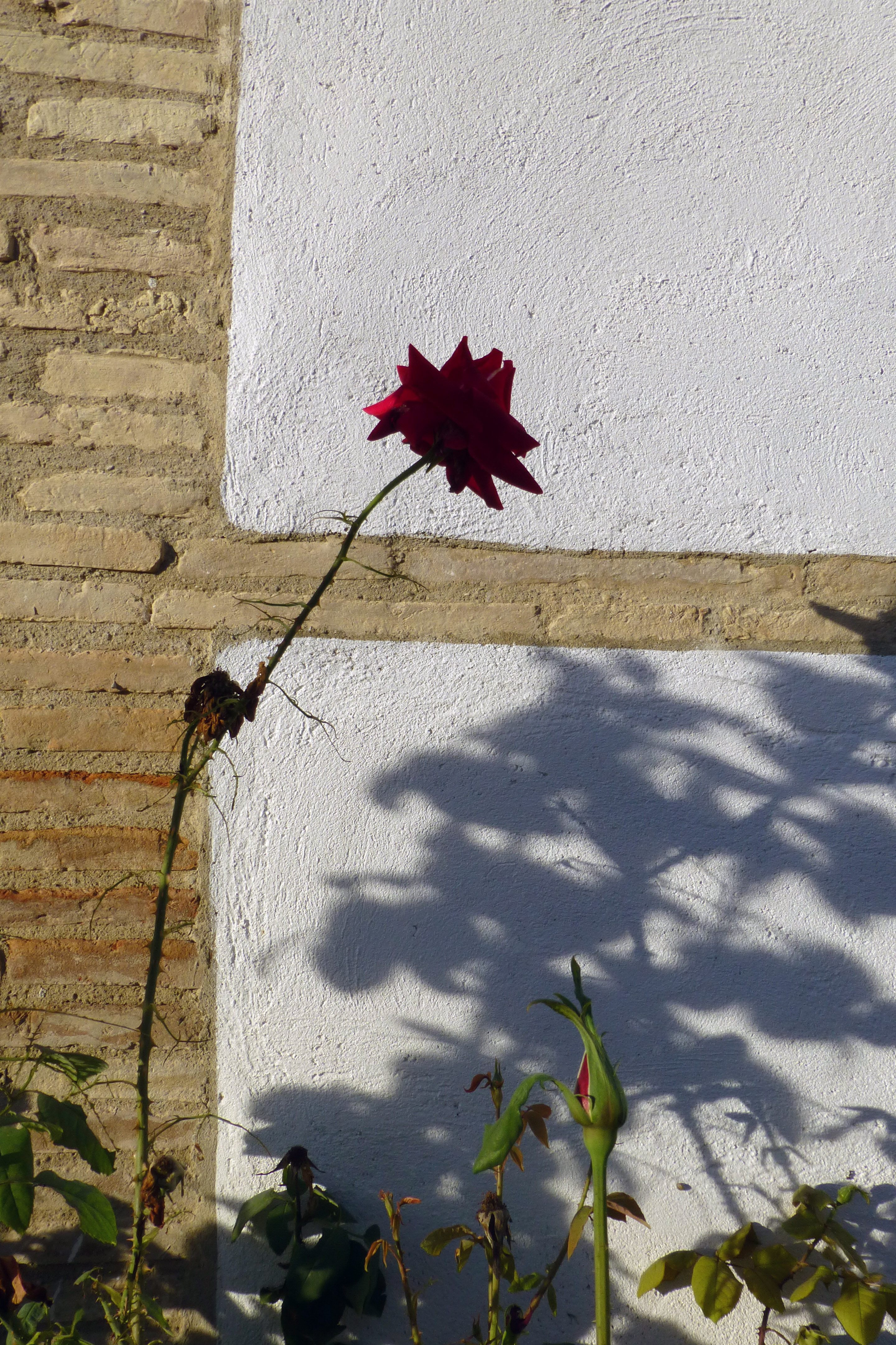 The outer cemetery is for outsiders: protestants, free-thinkers, suicides, I suppose still born infants. People who did not want to be buried by the church. People the church did not want to bury. A square space surrounded by that commonplace wall. A red rose straggles across it at one point with a sparse red flowers and few leaves. It wants pruning I thought, it has gone leggy. On the wall beside the rose is a dark metal plaque with some white artificial daisies in one corner