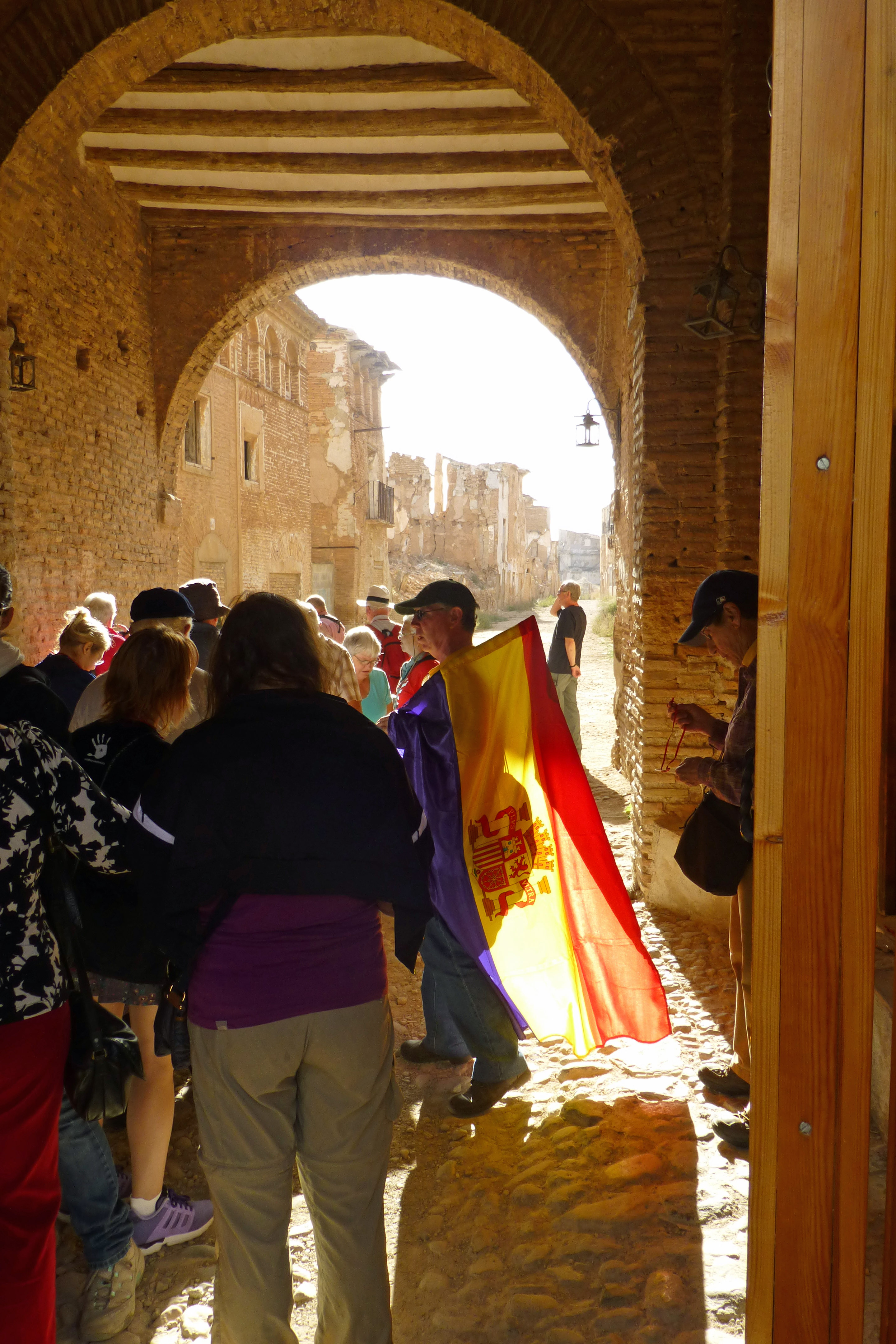 2014-10-19 Belchite 4Purple, yellow and red, our banners catch the sunlight streaming through the medieval gateway. It looks like a movie about the middle-ages, not a 21st century visit to a 20th century war zone. We have reached the old town, the ghost town, of Belchite. This arched gatehouse was one of the only ways in apart from the water conduits. The outer walls of town are the windowless backs of the outermost houses. Inside there were handsome town houses, many churches, convents, monasteries and also a hospital and a social club where people could dance or watch movies. Now all are ruined. A broken jigsaw of the architecture the tourists photograph in Zaragoza or Huesca.