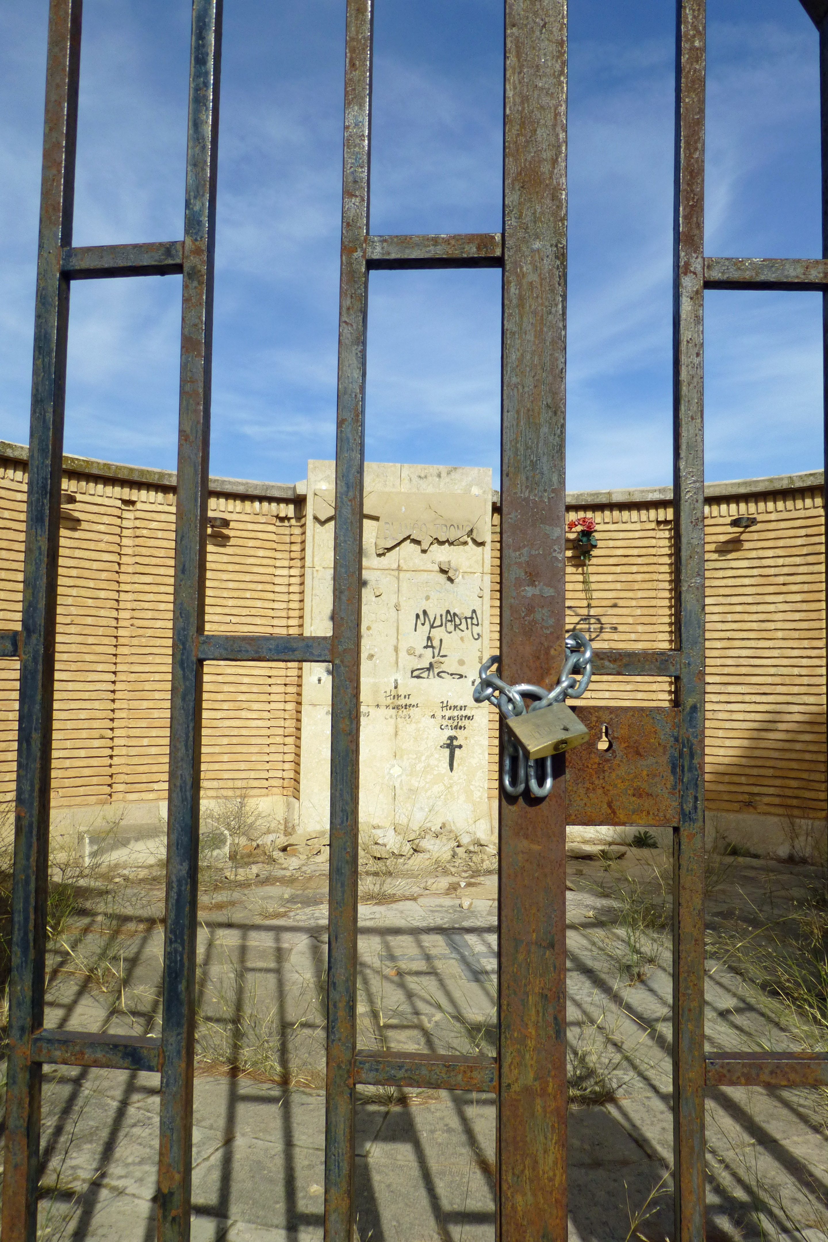 There were too many dead fighters to dig graves for, so they took them to the old olive oil mill and buried them there. The memorial is caged and padlocked, Behind the grille you can read the contested history of this war in layers of broken stone. First the fascists put up a memorial. After Franco’s death the Republicans did not destroy it but put another stone in front, hiding it. Falange sympathisers came in the night and broke the Republican monument but did not remove it. There are some spray-painted graffiti. No, not all the damage here was done by the weather.